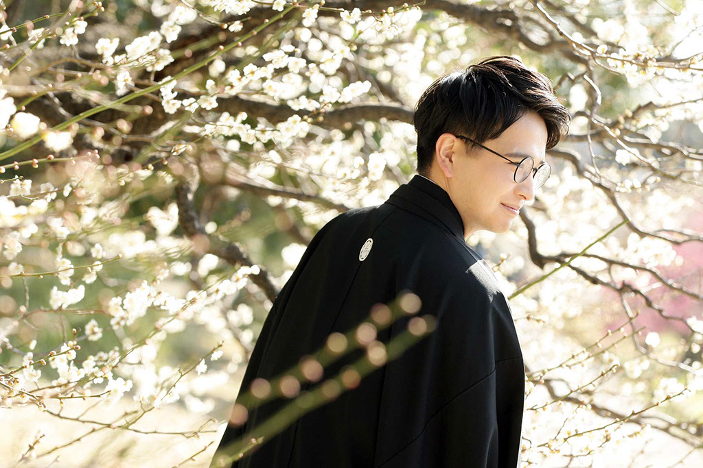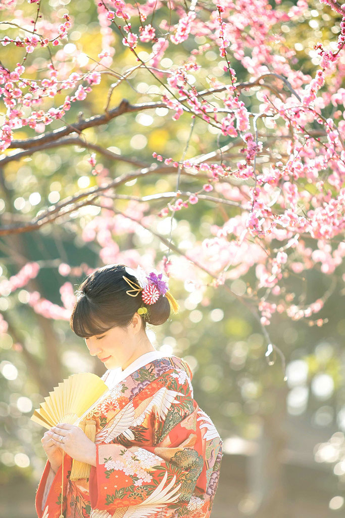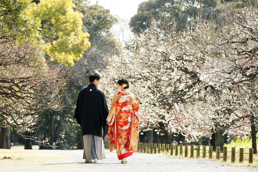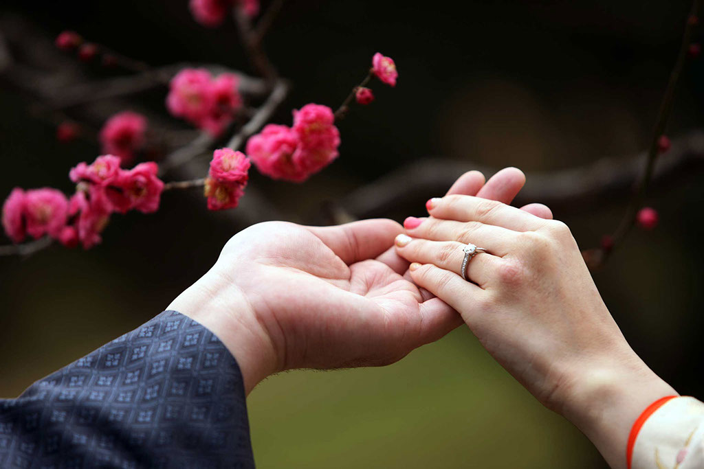 新春の引き締まった空気に光を受けた紅白梅がきらきらと、おふたりの写真を彩ります。