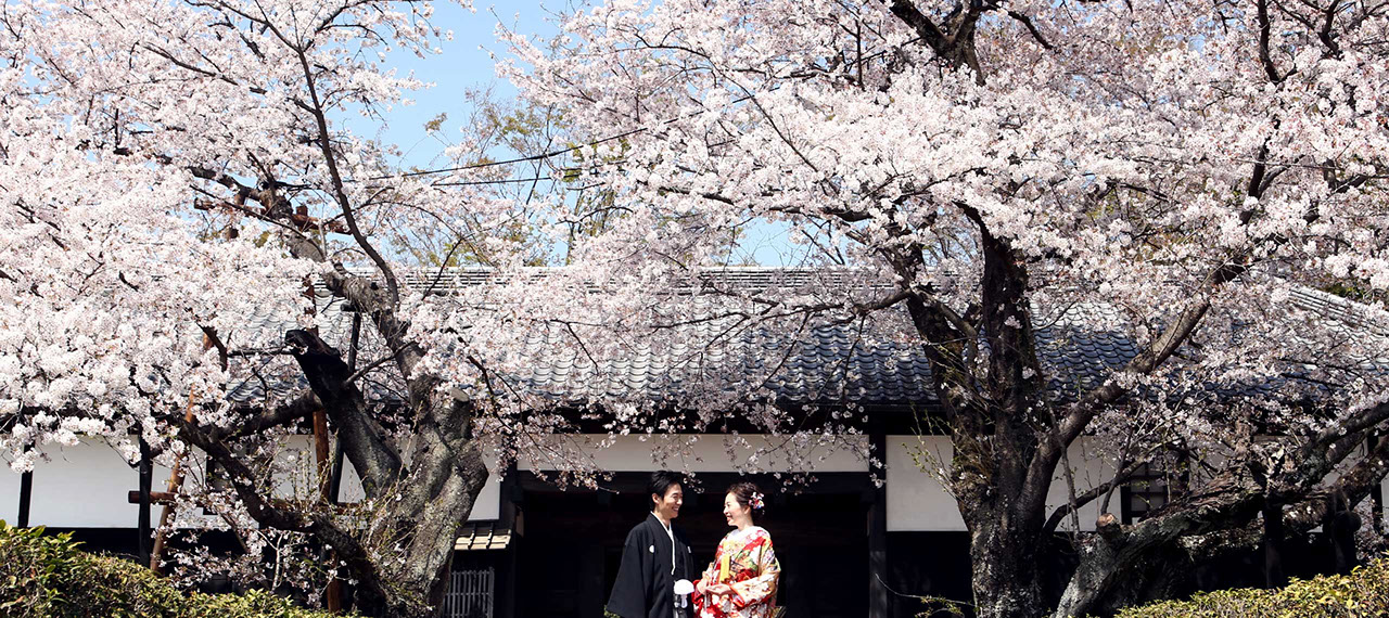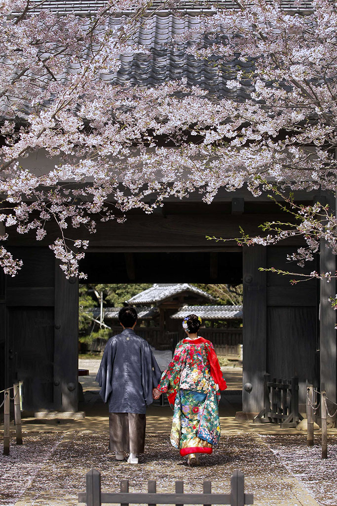 ふたりを祝福するかの様な門前で対に咲く大桜