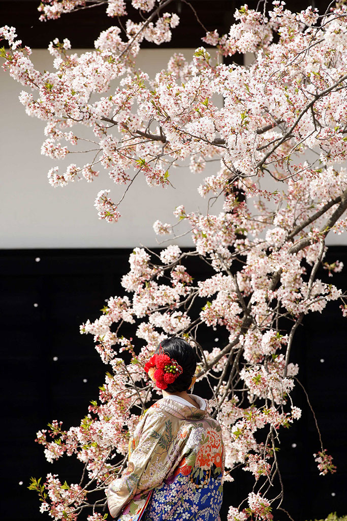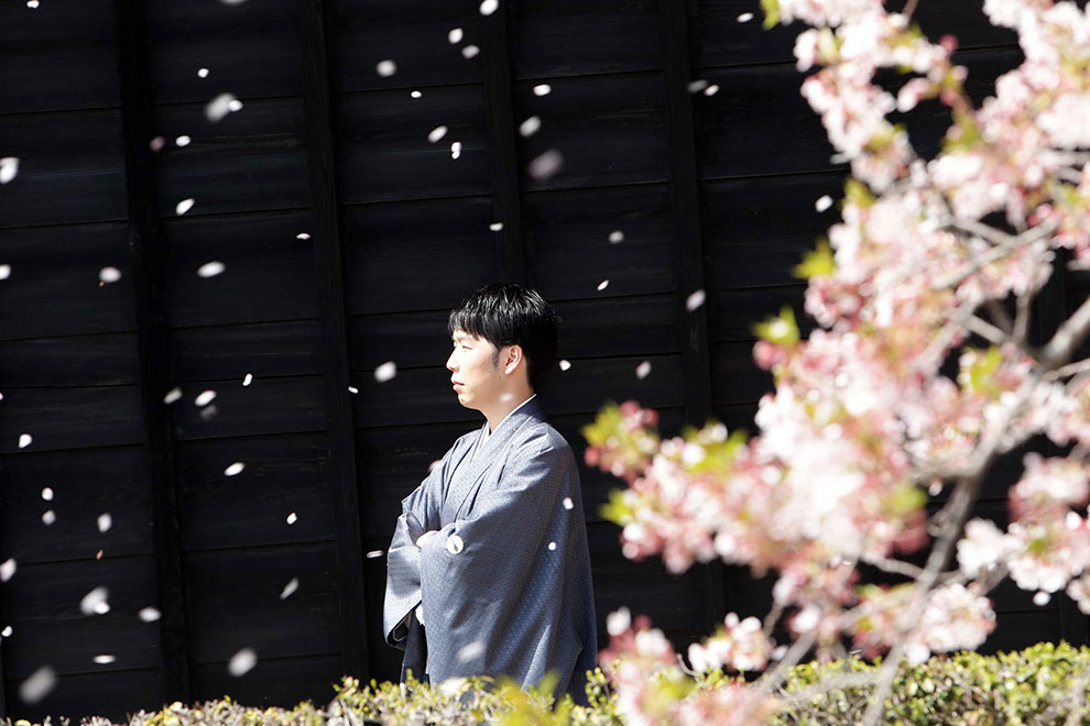 渋墨塗の黒壁を背景に散る姿は思わず息を呑む