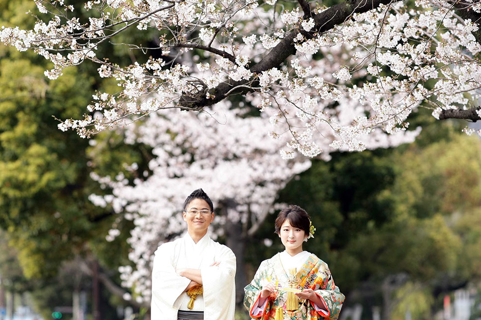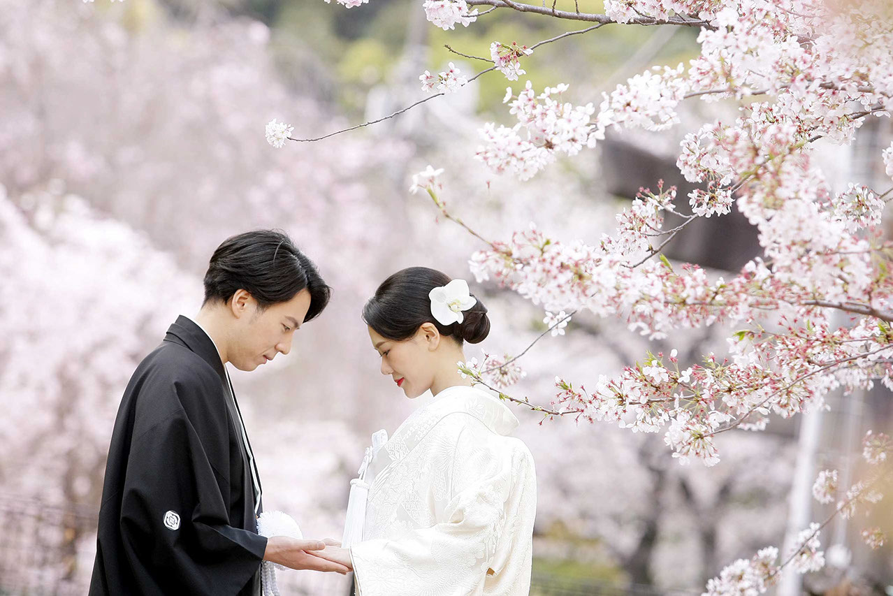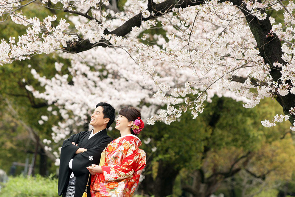 都に残る江戸の背景と透き通る様に広がる陽光が桜とふたりを際立てる