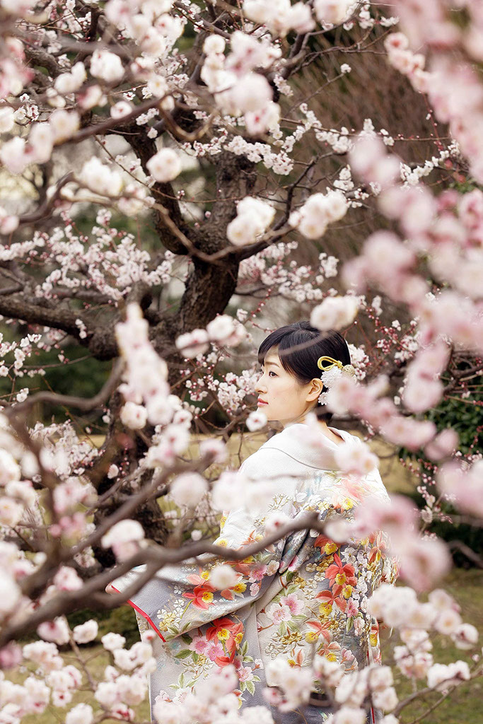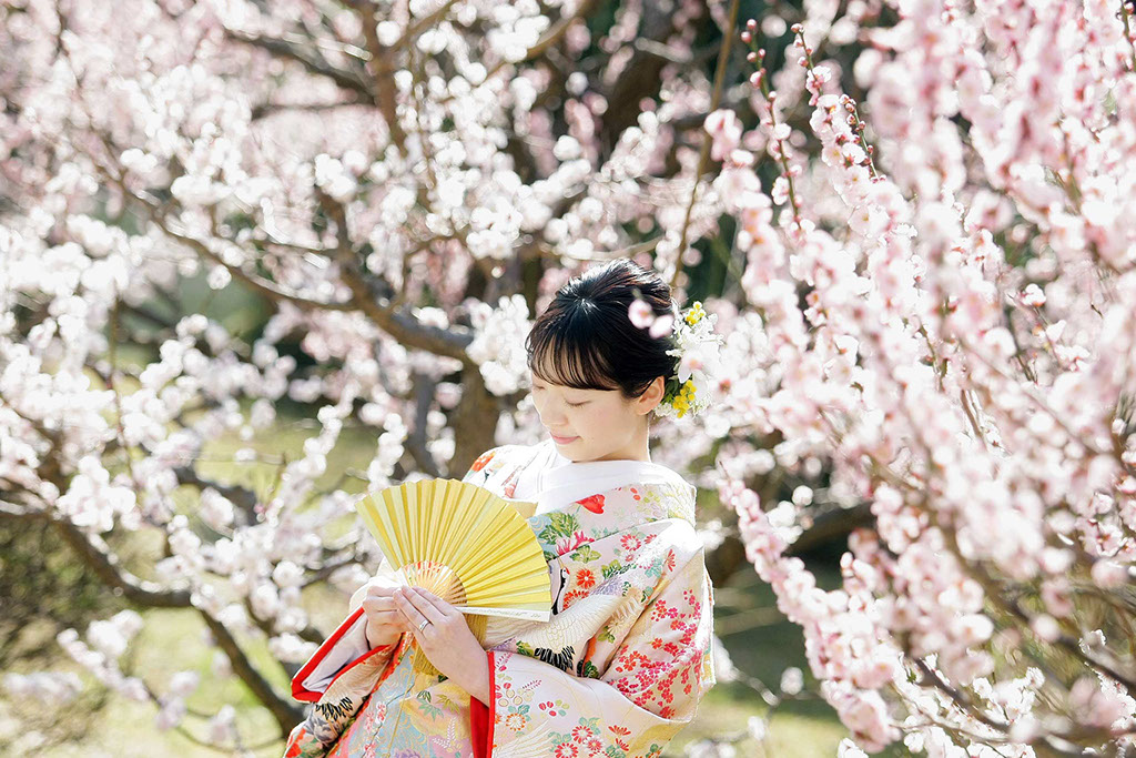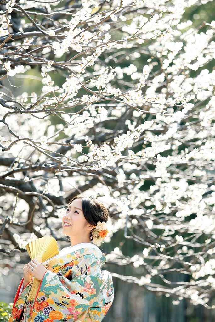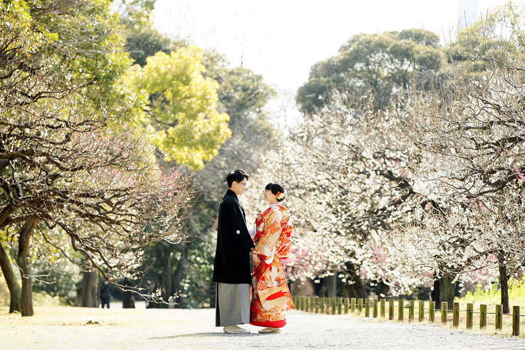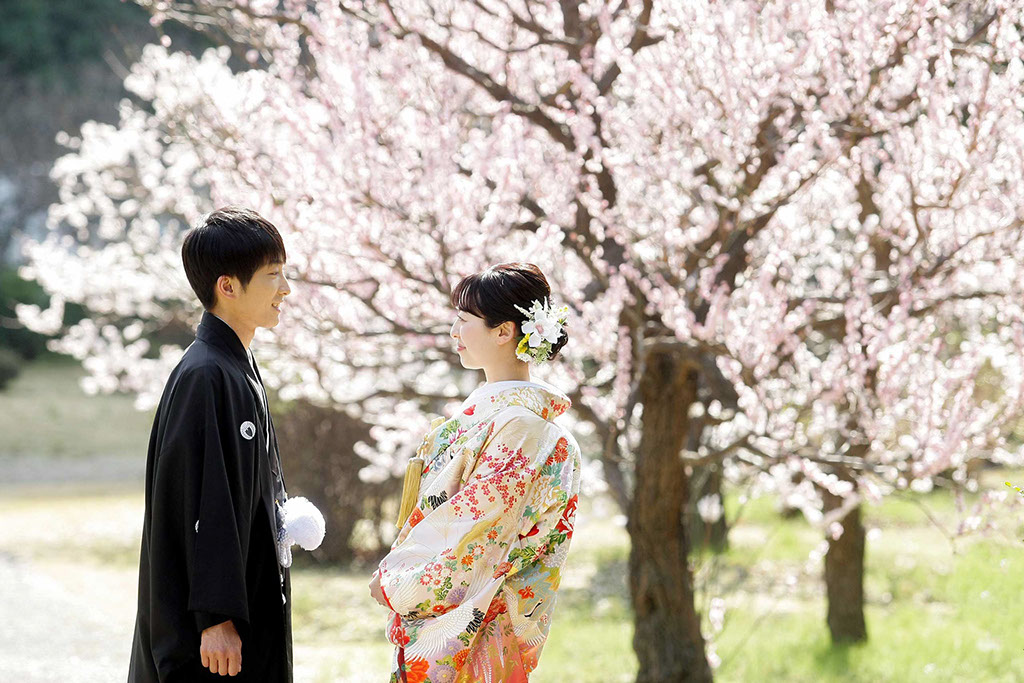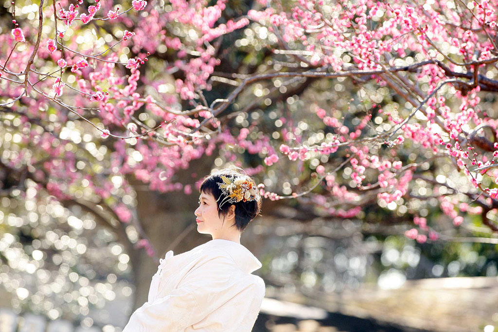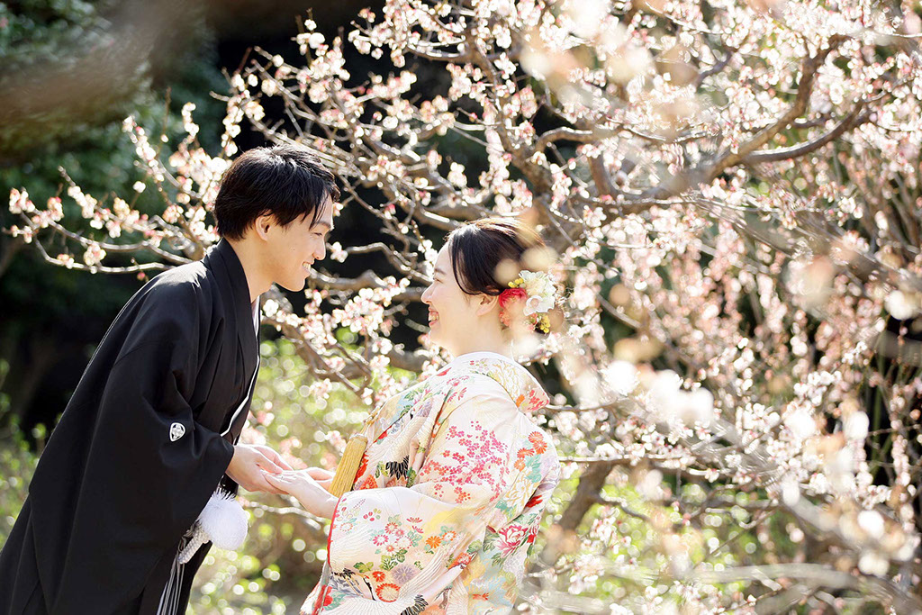 新春の引き締まった空気に光を受けた紅白梅がきらきらと、おふたりの写真を彩ります。