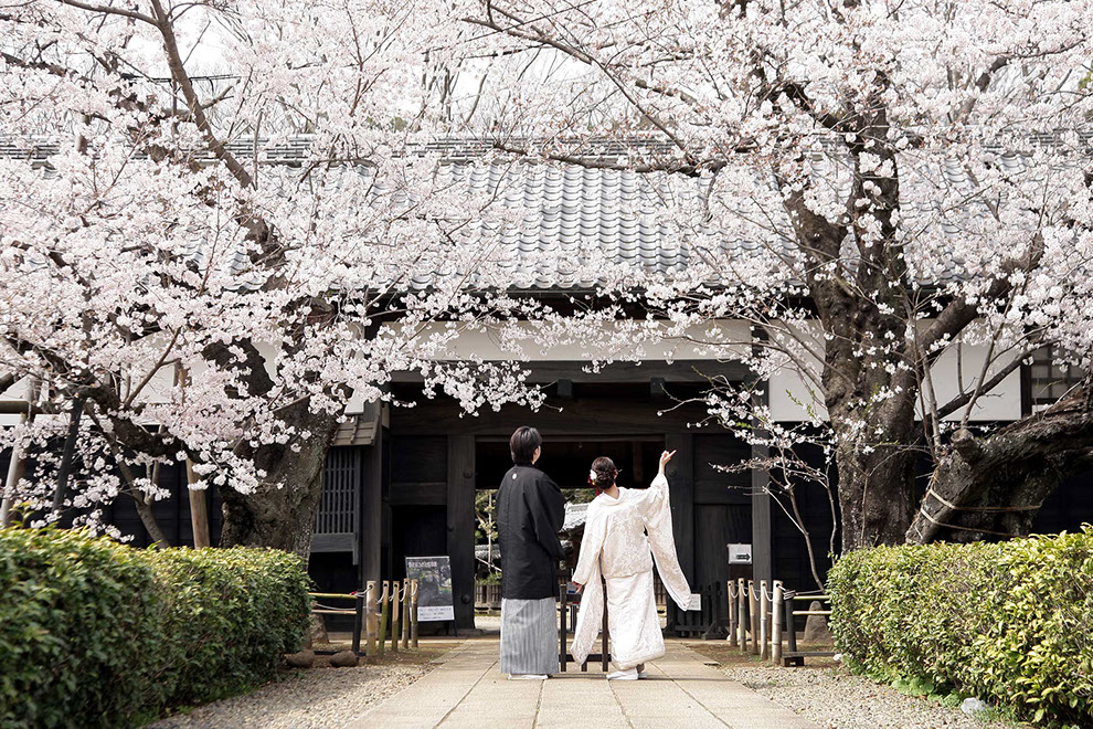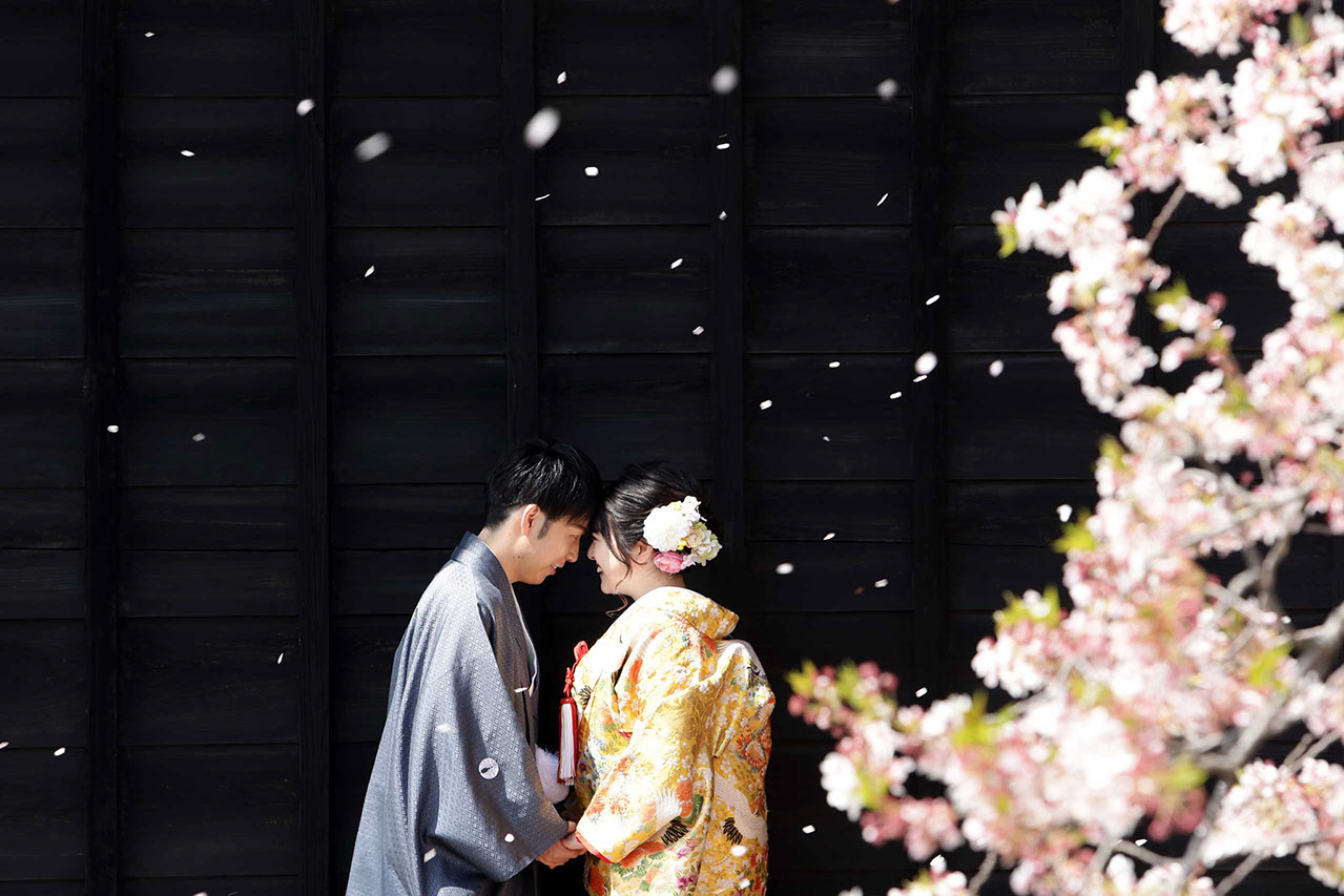 渋墨塗の黒壁を背景に散る姿は思わず息を呑む