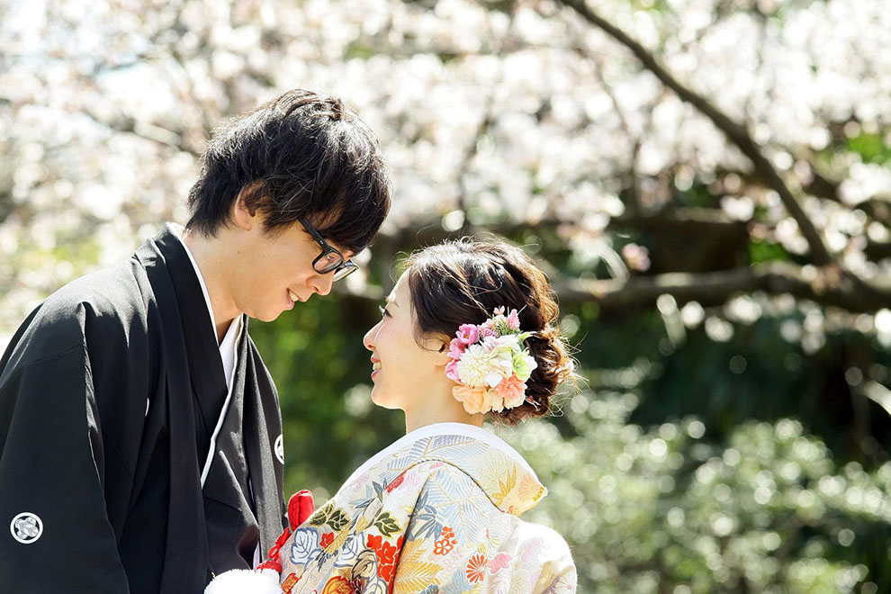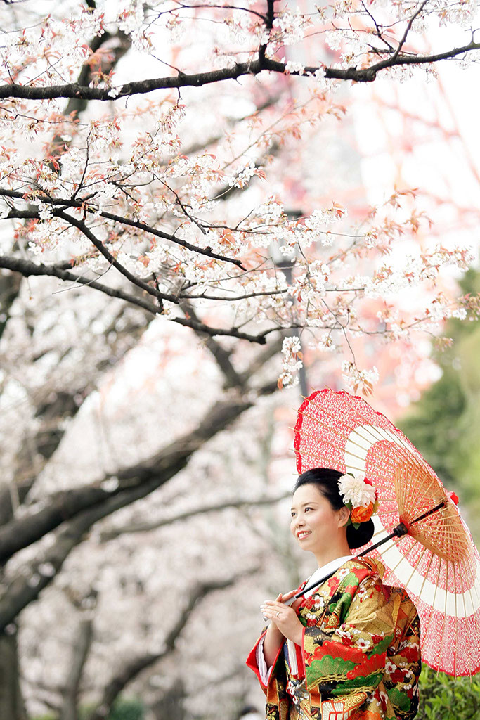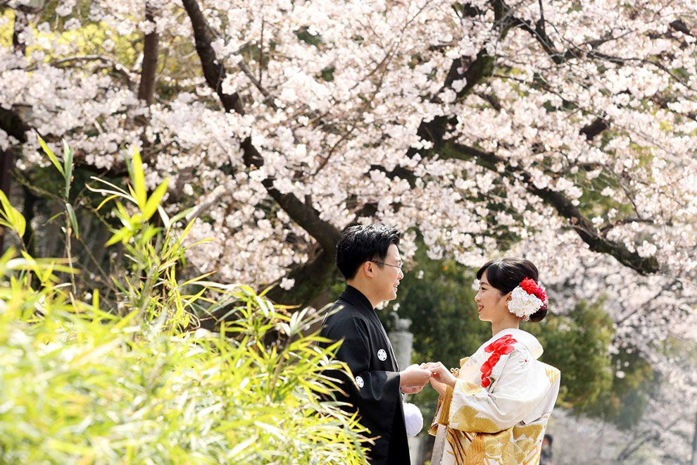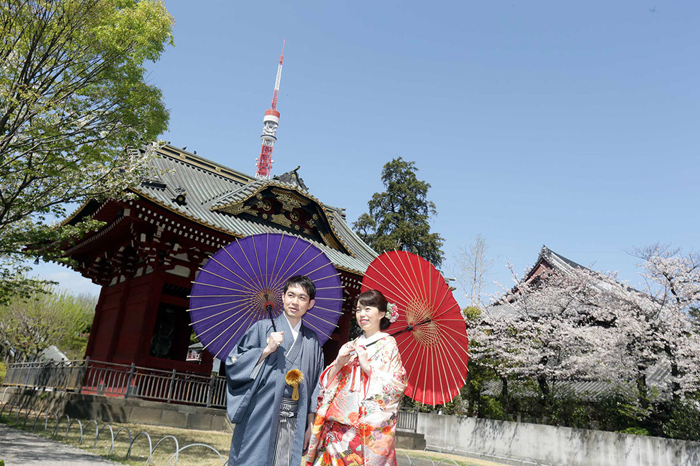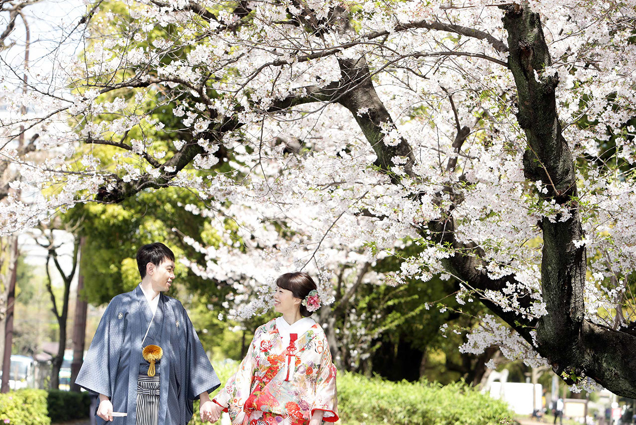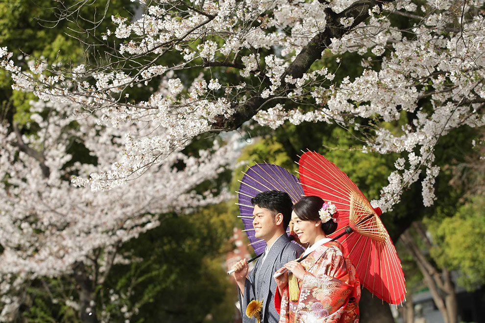 都に残る江戸の背景と透き通る様に広がる陽光が桜とふたりを際立てる